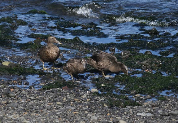 3 Eiders à duvet cherchant des mollusques à marée basse, algues.