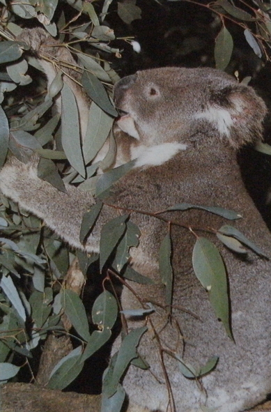A l'intérieur de ses joues, le koala dispose de poches extensibles, ou abajoues, dans lesquelles il peut accumuler de la nourriture. Son système digestif est parfaitement adapté à son régime très spécialisé : il ne s'intéresse qu'à une douzaine d'espèces d'eucalyptus, alors qu'on en trouve plus de cent en Australie. Et encore : il ne mange que certains types de feuilles à un stade bien précis de leur croissance. Un koala peut consommer jusqu'à un kilo de feuilles par jour. Aussi lui arrive-t-il d'épuiser rapidement la quantité de nourriture dont il dispose dans son environnement immédiat. C'est l'un des problèmes que pose sa survie à notre époque où les forêts d'eucalyptus se sont raréfiées. Et cela soulève également bien des difficultés pour l'élevage de koalas dans des réserves ou des parcs zoologique.